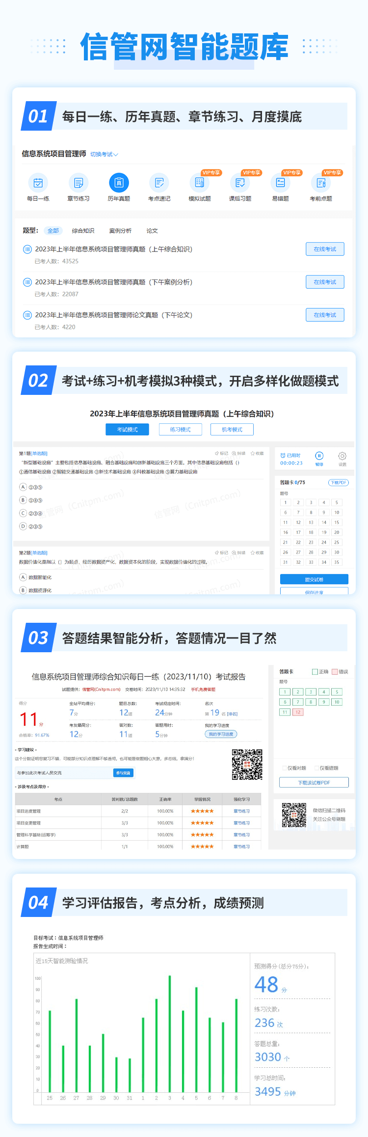信管網(wǎng)為信息化考試與服務專業(yè)平臺,目前開設有信息系統(tǒng)項目管理師、系統(tǒng)規(guī)劃與管理師、系統(tǒng)集成項目管理工程師、信息安全工程師考試與學習服務。提供了包括考試報名、考試課程、成績查詢、真題發(fā)布、資料下載、案例分析、論文、考試教程、在線題庫、每日一練、章節(jié)練習、信管人才、論壇交流等服務。我們將為廣大信管考友提供專業(yè)、及時、全面、貼心的考試服務,立足于為廣大信管考友建造一個優(yōu)質(zhì)的學習平臺,讓考生都能夠享受學習,順利通關(guān)。